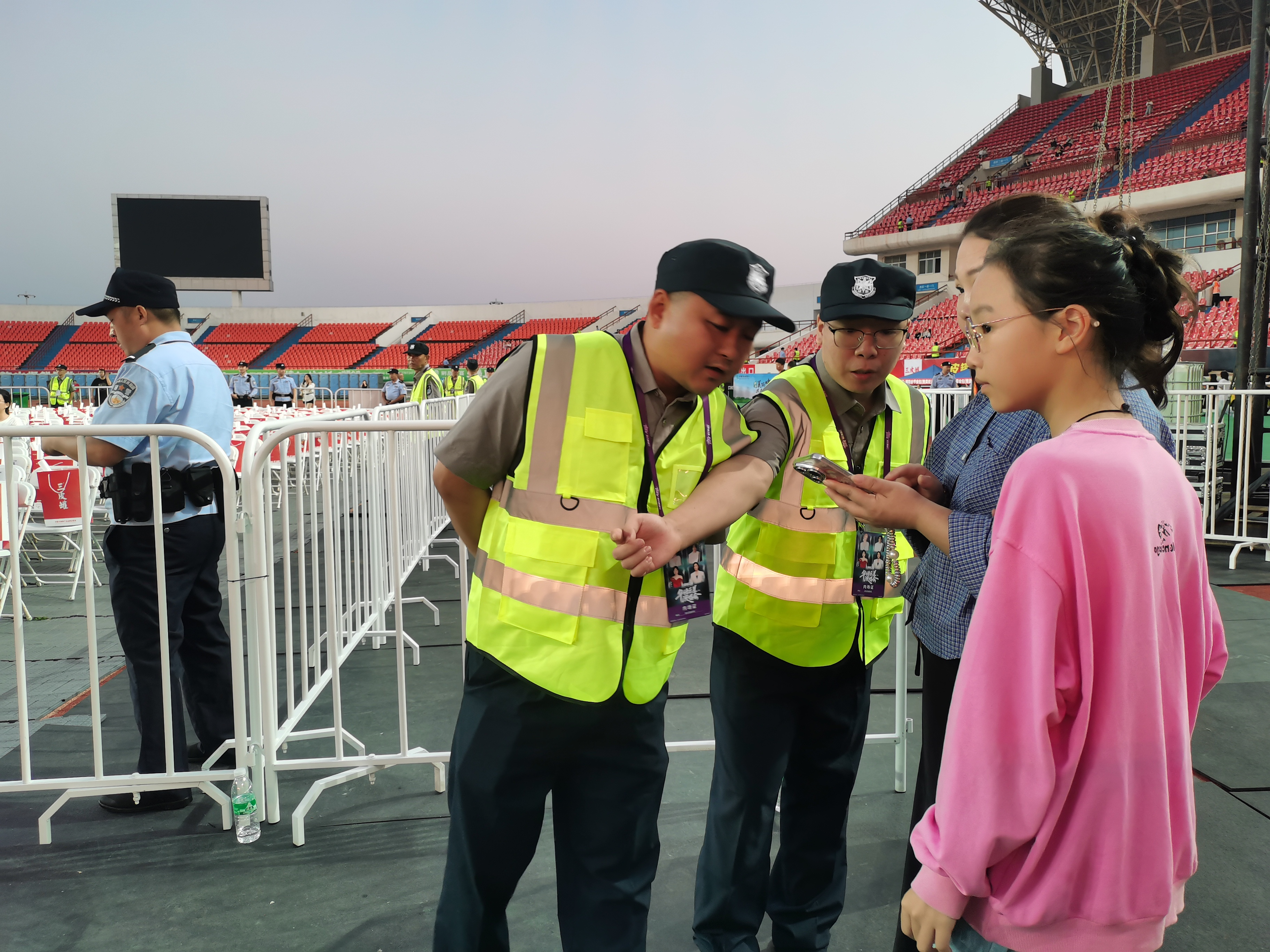 在入口處,隊員們麻利操作安檢儀,目光專注核查入場憑證,對觀眾攜帶的違規(guī)物品嚴格管控。內(nèi)場里,巡邏隊員的腳步從未停歇,他們始終面向觀眾站立,雙眼緊盯場內(nèi)動態(tài):看見觀眾情緒高漲站立觀看,立刻溫和勸阻;遇人找不到座位、尋求幫助,馬上上前指引。