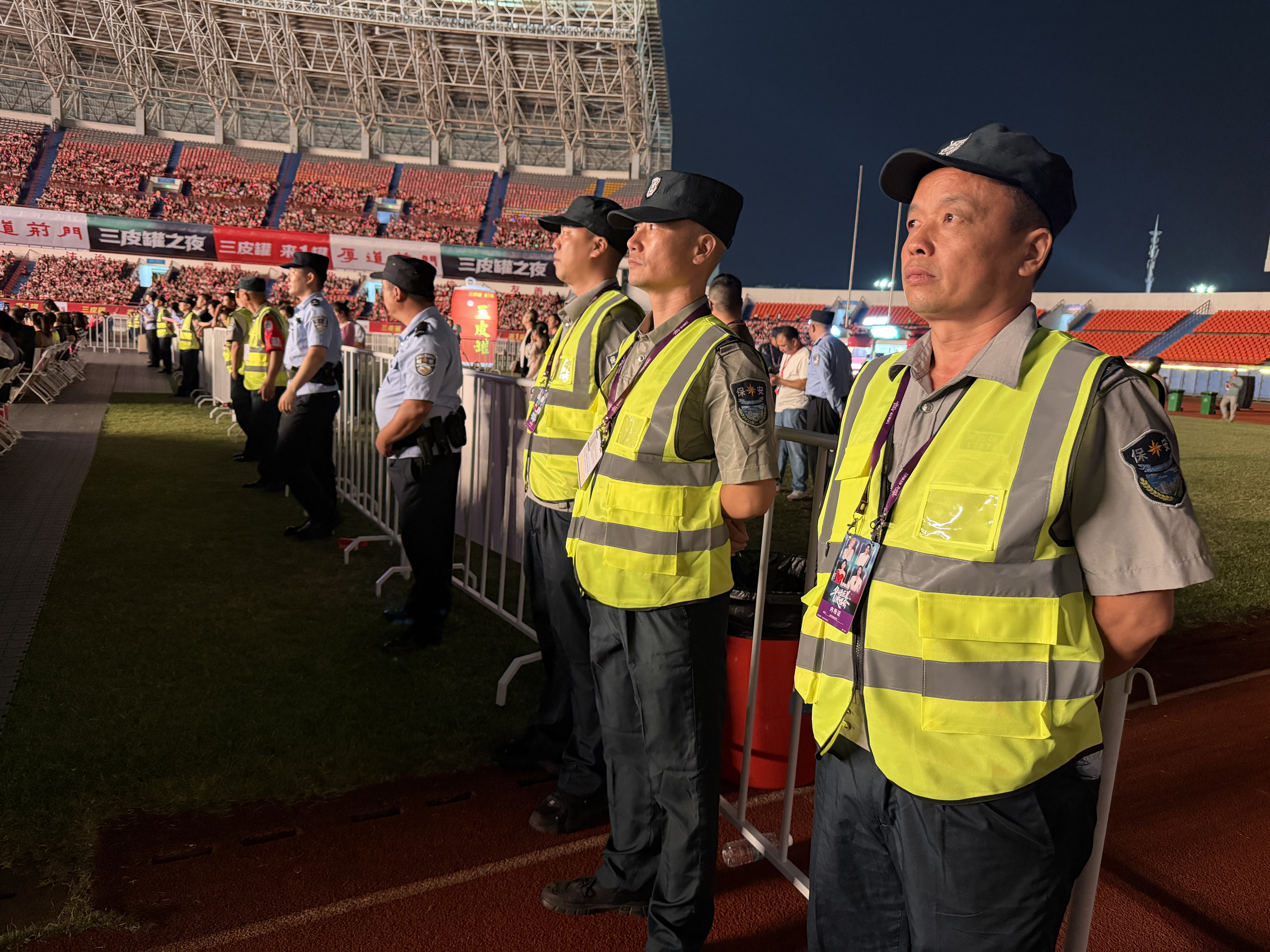 10月6日中秋月圓夜,荊門生態(tài)體育場的夜空被皎潔月光與璀璨星光點亮 ,兩萬余名觀眾揮舞熒光棒,隨著華語巨星的旋律合唱,沉浸在厚道荊門·暢享中秋 “三皮罐之夜” 華語巨星演唱會的狂歡里。而在這份熱鬧背后,湖北領(lǐng)威保安公司的 “熒光黃” 隊員,正用嚴謹態(tài)度與挺拔身影,筑起一道看不見卻最安心的安全屏障。