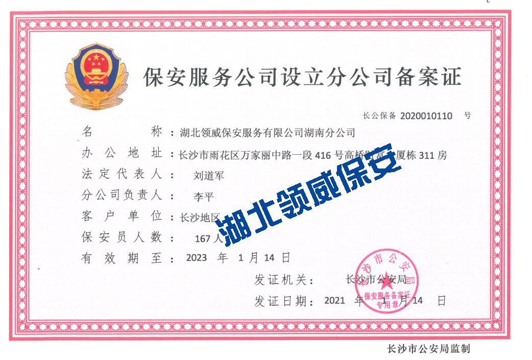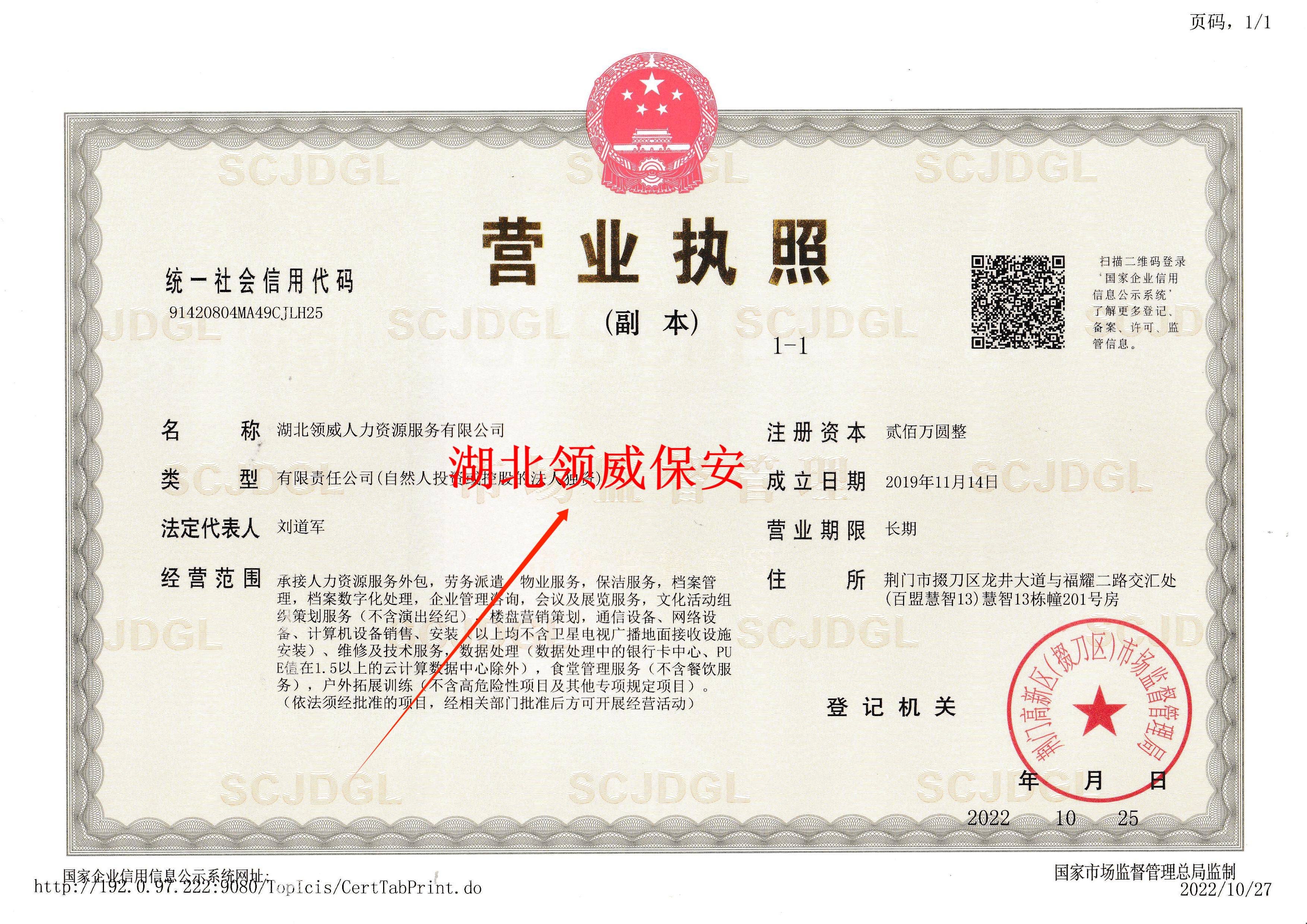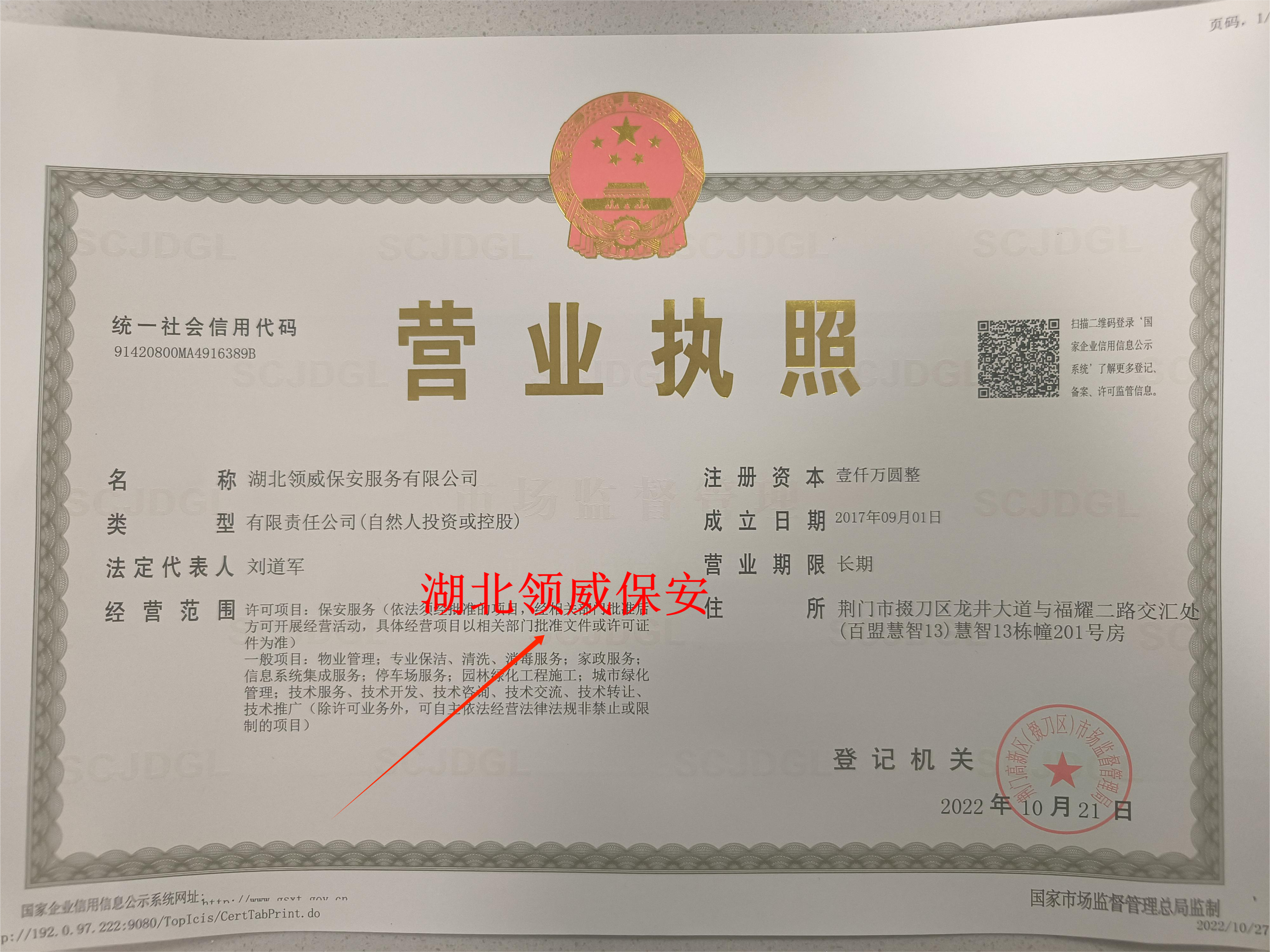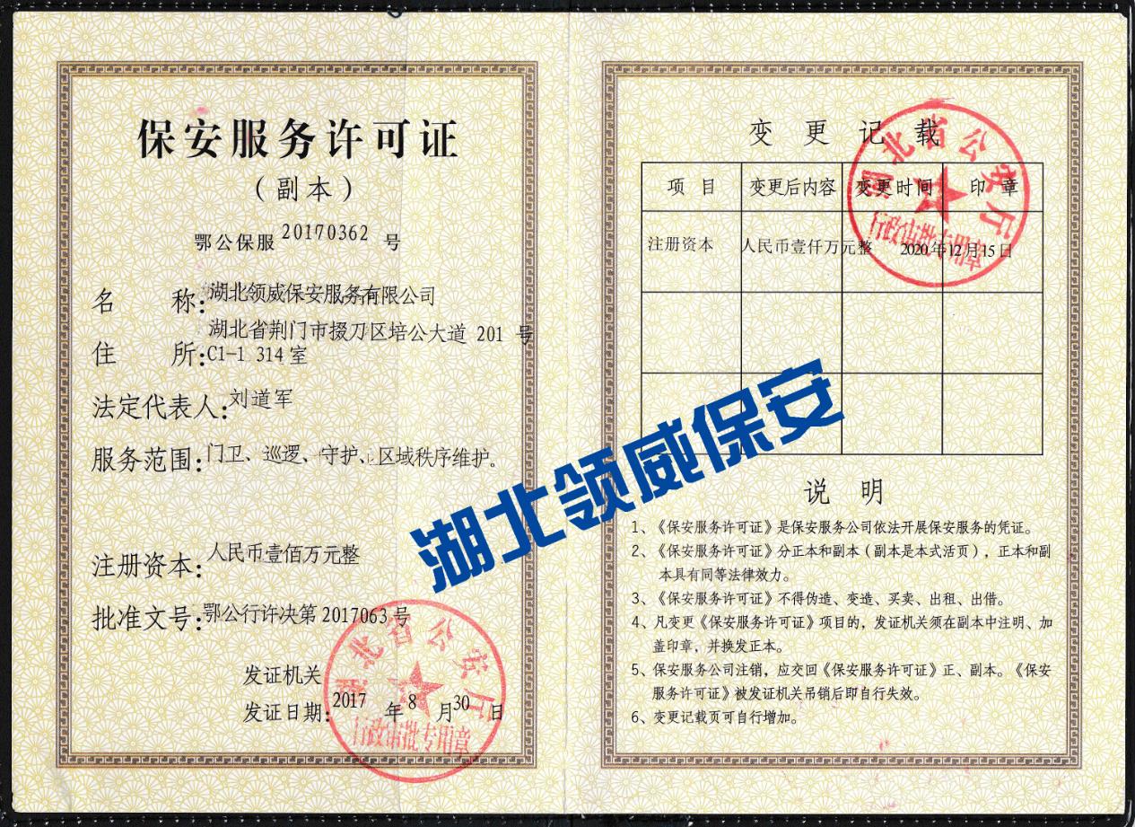 湖北領(lǐng)威保安服務(wù)有限公司資質(zhì):